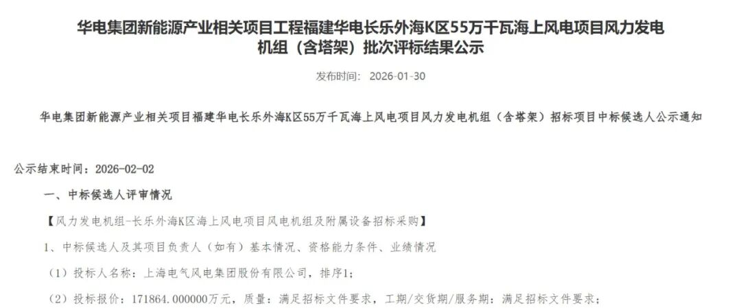 2月2日,华电集团新能源产业相关项目工程福建华电长乐外海K区55万千瓦海上风电项目公开招标结果公示结束。公示内容显示电气风电成功中标,将为该项目提供31台海神平台18MW机组。