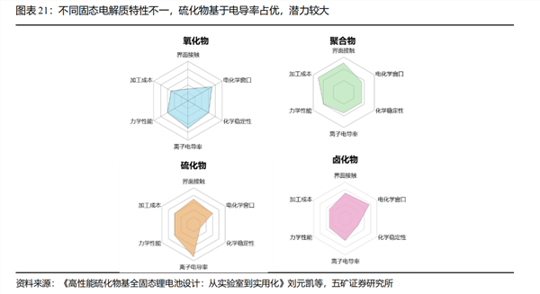 五矿证券指出基于电导率这一核心优势,硫化物为主的固态电解质成为企业较多选择,潜力较大。从四类主流电解质上看,聚合物电解质最早商业化,但室温离子电导率一般,性能潜力有限;氧化物化学稳定性强,但电导率一般,界面接触较差;卤化物化学稳定性较好,但导电率不够好;硫化物导电率好,但化学稳定性一般。从物理学上看,固态电解质本质是提供电导率,替代隔膜和电解液,电导率是核心指标。而硫化物离子电导率最接近液态电解质。宁德时代(300750)、比亚迪(002594)等企业均是硫化物为主的技术方案。