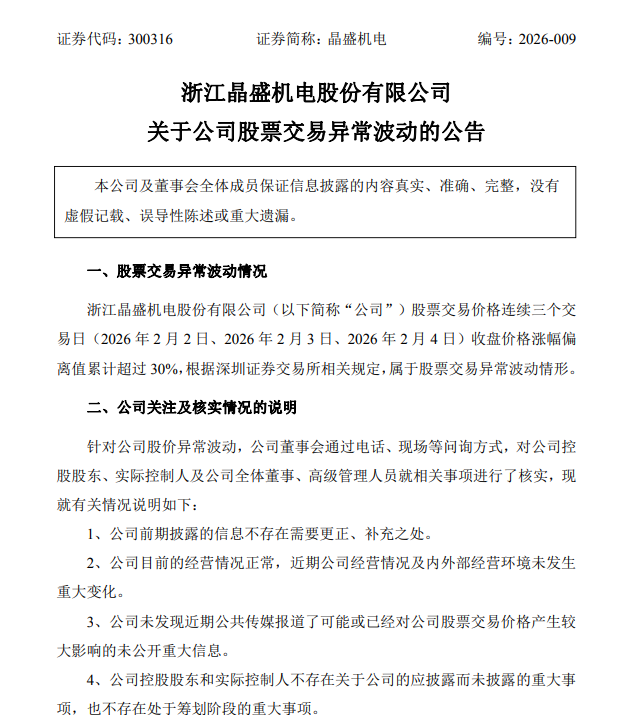 晶盛机电(300316)公告称,股票交易价格连续三个交易日收盘价格涨幅偏离值累计超过30%。近期资本市场对“太空光伏”等概念板块的关注度持续攀升,相关板块呈现出较高的市场热度。目前,“太空光伏”应用场景尚处于探索阶段,产业化进程仍面临不确定性。公司主营业务涵盖硅片、电池及组件等光伏产业链设备及石英坩埚、金刚线等辅材耗材的研发、生产、销售,随着市场对光伏领域的关注度不断提高,可能会间接影响投资者对公司未来业务拓展的预期。