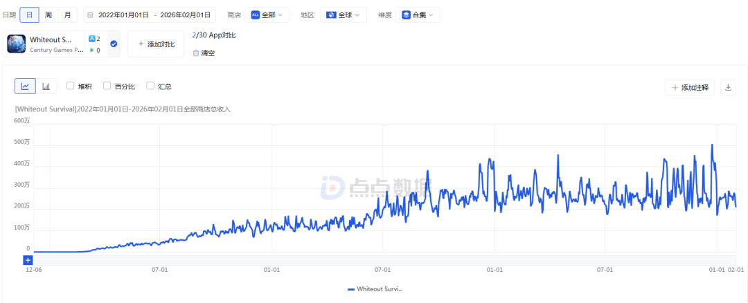 根据全球移动应用、游戏数据监测服务商点点数据的监测,《Whiteout Survival》(包括国内版本《无尽冬日》)来自全球iOS端的收入整体呈上升趋势,最近1年保持平稳。