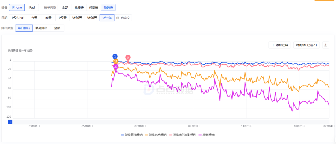 根据点点数据的监测,《杖剑传说》上线以来在中国内地iOS游戏畅销榜的排名最高达到11名,此后波动下滑,近期畅销排名有所回升。