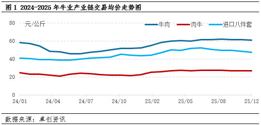 2025年国内肉牛市场整体运行轨迹可概括为“年初小幅冲高、年中震荡盘整、年末弱势收官”,核心逻辑围绕“情绪看涨、供应充裕、需求疲弱”的格局展开。卓创资讯(301299)监测数据显示,2025年肉牛交易均价26.45元/公斤,同比上涨16.68%;国产鲜牛肉批发均价为59.53元/公斤,同比上涨17.56%;进口牛肉八件套均价达48.64元/公斤,同比上涨18.83%。