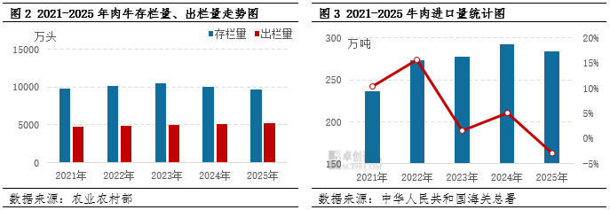 2025年国内肉牛供应整体呈现“国内产能去化缓慢、进口牛肉库存高位”的双重特征,成为压制价格持续上行的核心因素。国内产能方面,能繁母牛去化进程持续放缓,导致商品牛供应依然充足。根据农业农村部数据显示,2025年全年肉牛存栏量达到9608.00万头,同比减少4.37%。2025年肉牛出栏量为5133万头,同比增加0.67%。牛肉产量801.00万吨,同比增长2.82%,创近五年同期新高,进一步印证国内供应充裕的格局。