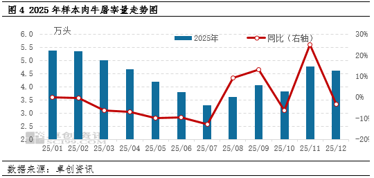 2025年国内肉牛需求整体呈现“缓慢复苏、结构分化”的特征,终端消费支撑力度不足,成为制约价格上行的另一核心因素。餐饮、食品深加工优先选择进口牛肉替代,2025年餐饮行业客流量恢复缓慢,中低端餐饮企业为控制成本,牛肉采购量有限,转而选用性价比更高的冻肉或猪肉、禽肉替代品,导致国产、进口牛肉需求承压。卓创资讯监测数据显示,2025年样本屠宰企业总屠宰量为52.50万头,同比降幅12.81%。