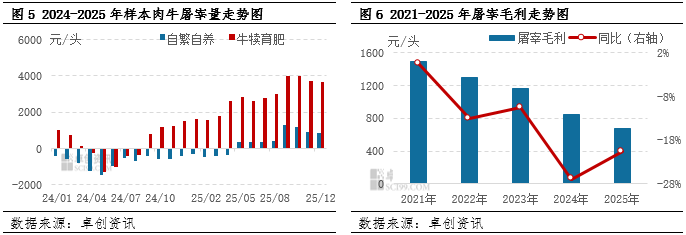 2025年肉牛育肥盈利和自繁自养走势环比上涨,根据卓创资讯数据统计,2025年内肉牛自繁自养理论盈利均值348.41元/头,同比上涨148.73%,育肥理论盈利均值2845.83元/头,环比上涨925.52%。从自繁自养盈利来看,年内肉牛、牛犊价格上涨,繁育户盈利空间扩大,自繁自养盈利水平由亏转盈;部分散户受养殖周期长盈利水平欠佳,市场仍有积极宰杀母牛行为。而牛犊育肥盈利来看,受益于出栏肉牛对应前期较低的补栏成本,盈利空间增幅显著。