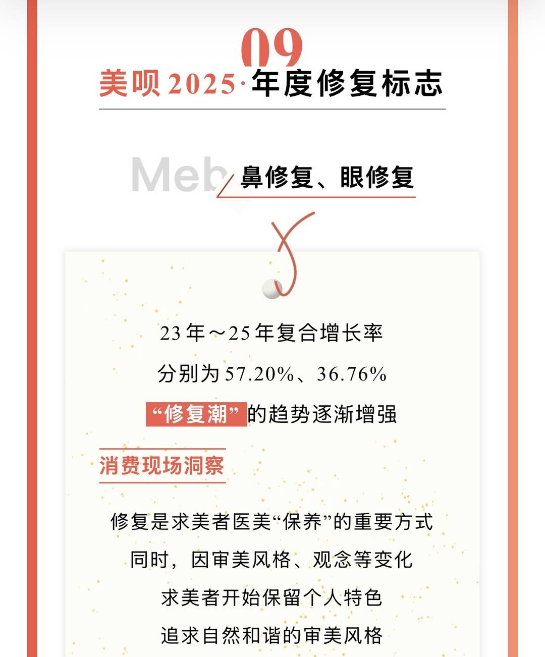 记者注意到,榜单指出,“修复潮”的趋势逐渐增强,鼻修复、眼修复2023年~2025年复合增长率分别为57.20%、36.76%。修复是求美者进行医美“保养的重要方式。同时,因审美风格、观念等变化,求美者开始保留个人特色,追求自然和谐的审美风格。