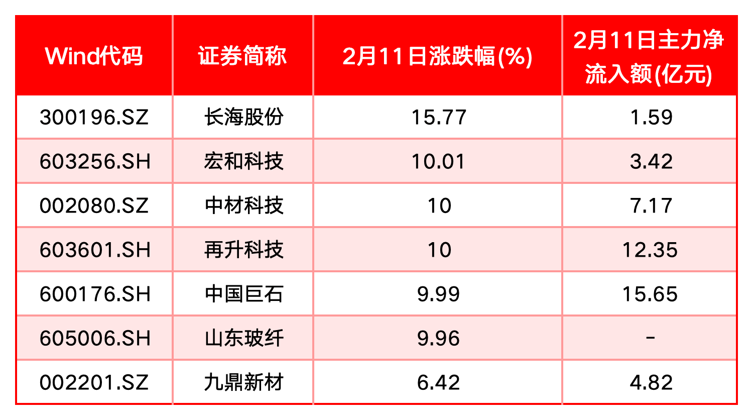 玻纤概念板块中多只个股涨幅显著,其中长海股份(300196)以15.77%的涨幅居首,宏和科技(603256)、中材科技(002080)、再升科技(603601)、中国巨石(600176)等多股涨幅超10%,国际复材(301526)(301526.SZ)盘中一度20%涨停,市值突破445亿元。今日主要上涨个股表现如下: