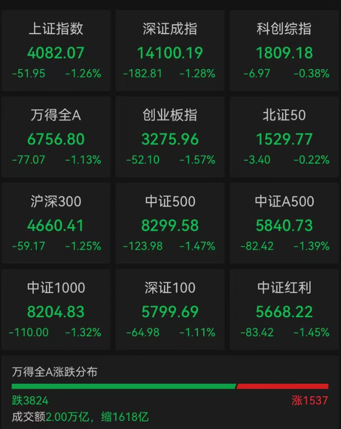 沪深京三市成交额19989亿元,较上日缩量1618亿元,三市1537只个股上涨,3824只个股下跌。