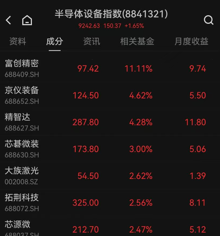 半导体设备指数涨1.65%,富创精密大涨11%。