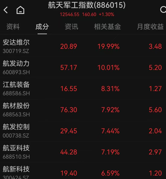 航天军工指数涨1.3%,安达维尔(300719)、航发动力(600893)涨停。