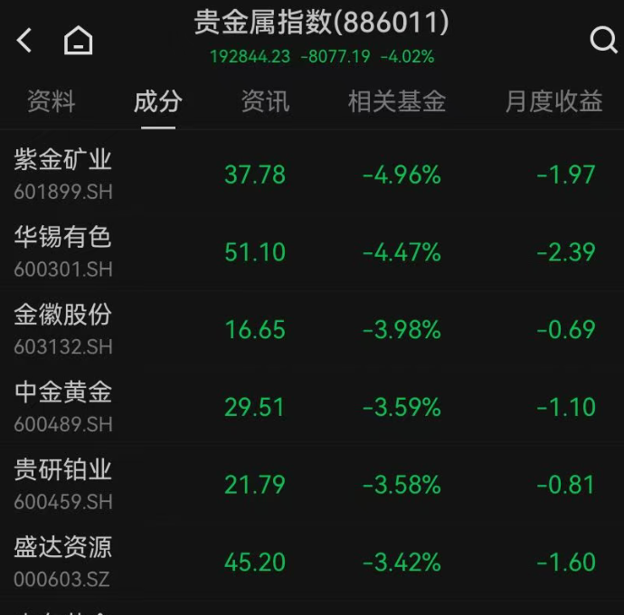 贵金属指数跌超4%,紫金矿业(601899)跌近5%。