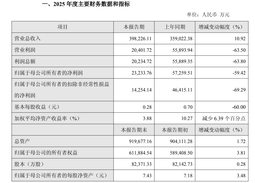 2月13日,复旦微电(688385.SH)披露2025年度业绩快报,全年营业收入39.82亿元,同比增长10.92%;归属于上市公司股东的净利润2.32亿元,同比下降59.42%。
