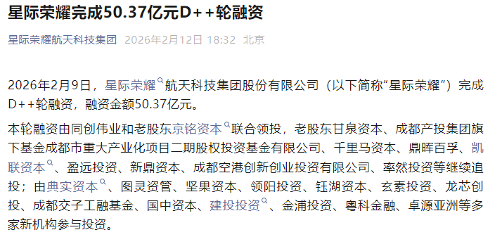 近日,星际荣耀官微宣布,公司于2月9日完成D++轮融资,融资金额50.37亿元。值得一提的是,这是截至目前国内商业火箭企业斩获的最大单笔融资。