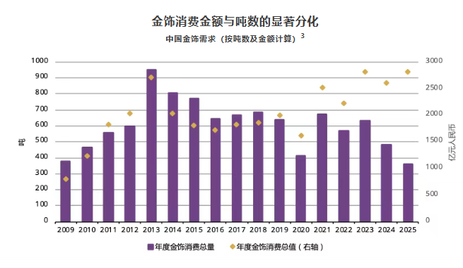 据世界黄金协会消息,2025年,中国金饰实物需求为360吨,同比下滑25%,但消费总额达2,814亿元人民币(约合394亿美元),同比增长8%,接近2023年历史高点,反映消费意愿持续增强。