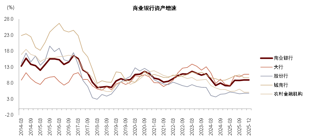 图表:2025年末商业银行总资产同比+9%至415万亿元,增速较此前略有加快,其中大行和城商行增速较快