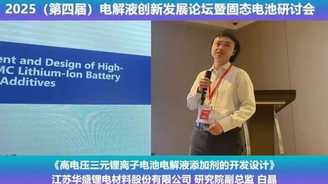 2025年7月10-11日,由中国石油和化学工业联合会中小企业工作委员会指导、北京国化新材料技术研究院主办的"2025(第四届)电解液创新发展论坛暨固态电池研讨会"在浙江衢州隆重召开。华盛锂电总部研究院副总监白晶作为特邀专家,在主题报告《高电压中镍三元锂离子电池电解液添加剂的开发设计》中深度剖析行业趋势。