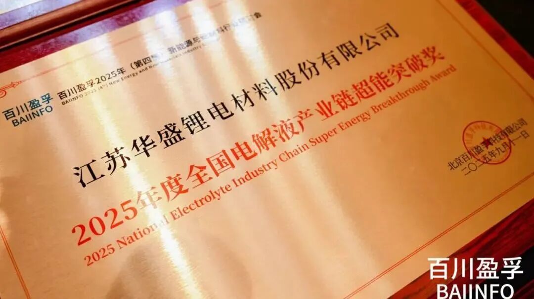 华盛锂电凭借在电解液领域的核心技术突破与产业链贡献,荣获主办方颁发的“2025年度全国电解液产业链超能突破奖”!