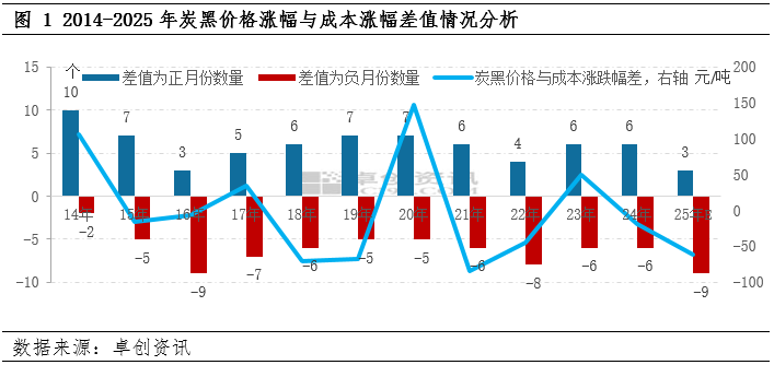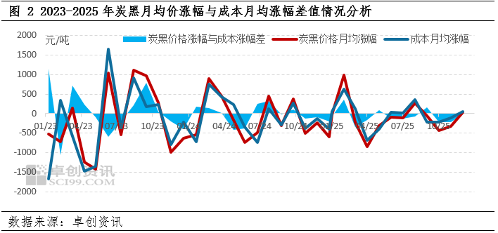从近十年炭黑月均价涨幅与成本月均涨幅差值情况来看(以山东市场高温煤焦油—炭黑N330价格为例,下同),(注:月度涨幅差值=月度炭黑均价涨幅-月度炭黑成本均价涨幅,差值为正代表月度单吨利润空间提升,差值为负代表月度单吨利润空间下滑)。由图1可见,炭黑单吨盈利空间相对容易扩大年份在2017年、2020年、2023年,近十年主流大型炭黑厂通过扩大产能、降低生产成本、优化客户结构等方式保证整体企业盈利水平基本呈现韧性震荡向好趋势。但2024-2025年炭黑行业出现首次连续两年差值均呈现负数的情况,尤其是2025年亦是近十年来除2016年外差值为正最少的年份,也就是说2025年9个月份中炭黑利润空间都处于收窄阶段, 2024年炭黑价格超跌集中在四季度,其行业盈利水平能力的下滑也更多传导至2025年,综上2025年整体炭黑行业盈利水平或呈现较大下滑趋势。
