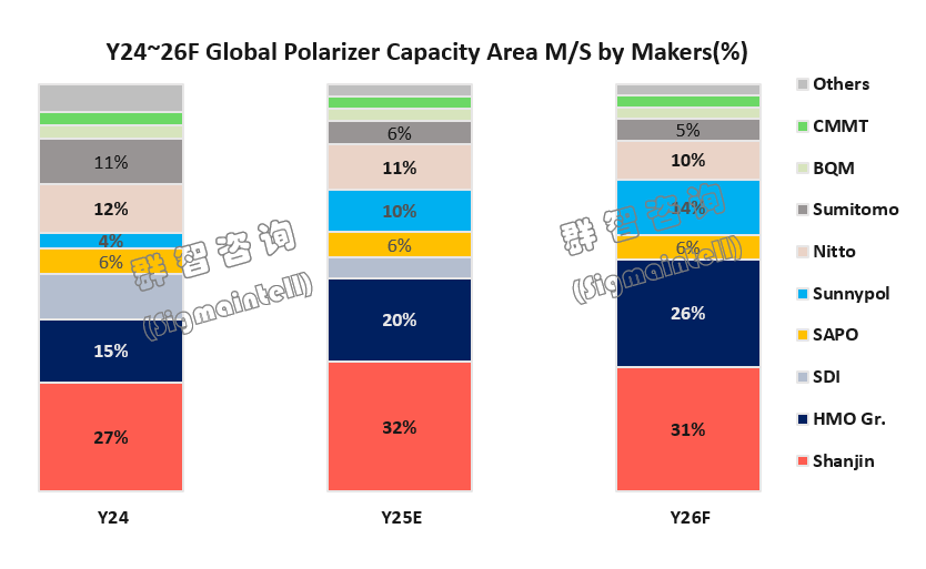 群智咨询(Sigmaitnell)统计数据显示,2025年杉金光电的产能占比超30%,居全球第一;恒美通过并购吸收原SDI的产线,全球产能市占快速提升并超越20%,预计2026年恒美集团全球产能份额将进一步提升至26%,稳居全球第二,未来恒美集团通过更加积极的新产线投资,尤其是3m超宽产线的投资,有望进一步缩小与杉金光电的产能差距。