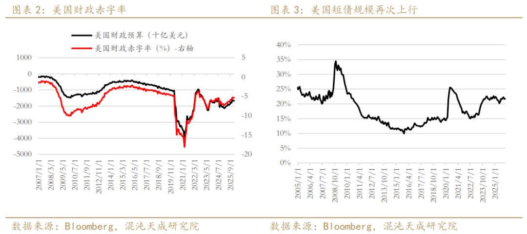 美元信用逻辑的演绎仍以叙事为主,债务信用和美联储独立性成为关键因素。截至2025年第四季度,美国联邦政府债务规模突破 38万亿美元,且根据2025年12月的最新财政数据,美国财政赤字率在经历了短暂两个月的收缩后,重新扩张至 5.85%。从财政数据来看,短债比例再次上行,同步上行的还有财政利息的支出比例以及债务规模,这侧面反映财政状况仍存在明显风险。