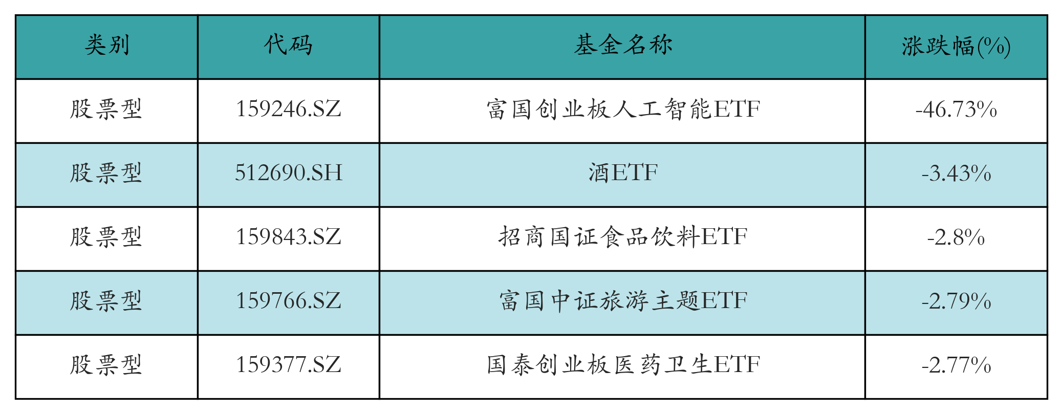 节前一周股票型ETF跌幅最大的5只ETF及其收益率分别为:富国创业板人工智能ETF(-46.73%)、酒ETF(-3.43%)、招商国证食品饮料ETF(-2.8%)、富国中证旅游主题ETF(-2.79%)、国泰创业板医药卫生ETF(-2.77%)。详情见下表: