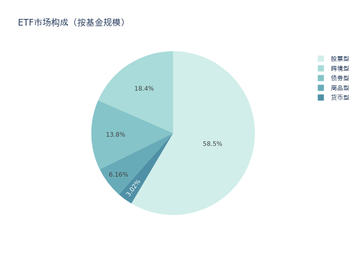 基金规模方面,节前一周ETF市场总规模达到53638.61亿元,较前一周增加342.22亿元。其中,股票型ETF为31390.9亿元,债券型ETF为7427.76亿元,货币型ETF为1619.1亿元,商品型ETF为3306.4亿元,跨境型ETF为9894.45亿元。