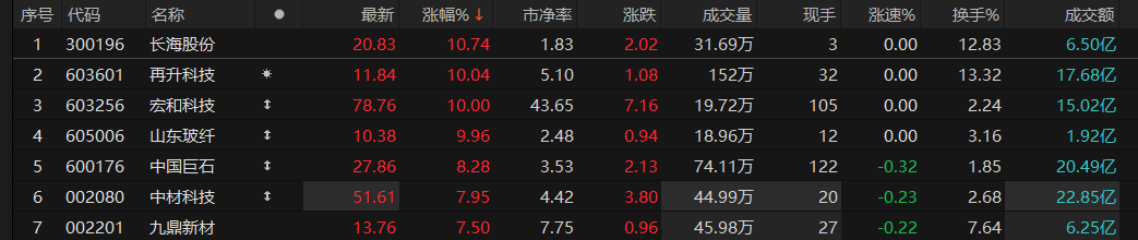 玻纤概念反复活跃,多股涨停。其中再升科技(603601)、宏和科技(603256)、山东玻纤(605006)涨停。