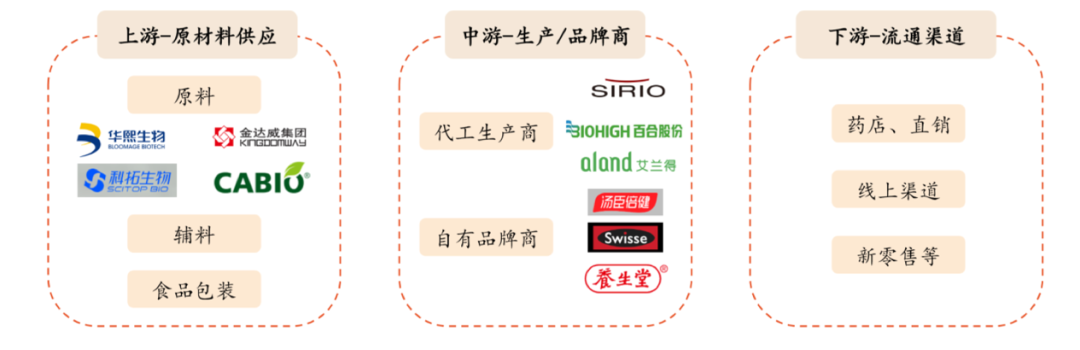 中国保健品行业已形成分工明确的产业链布局,上游为原料生产研发、中游为合同加工、下游为品牌销售,各环节呈现差异化发展特征,代表性品牌分别占据产业链不同环节的核心地位,推动产业链协同发展。