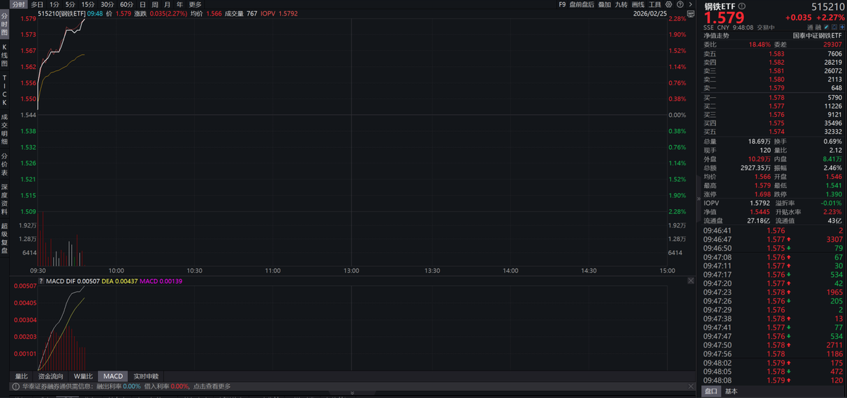 当前钢铁板块正站在一个“预期低位、基本面筑底、催化将至”的拐点上。在基本面、政策面、成本面三重共振下,钢铁板块的上涨弹性值得期待,全市场唯一钢铁ETF(515210)涨超2%。