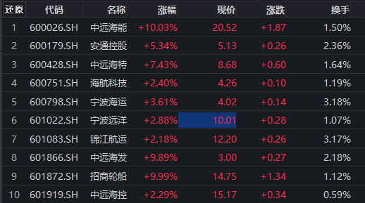 航运板块反复走强,招商轮船(601872)4天3板,续创历史新高,中远海能(600026)、招商南油(601975)、中远海特(600428)、中远海发(601866)跟涨。