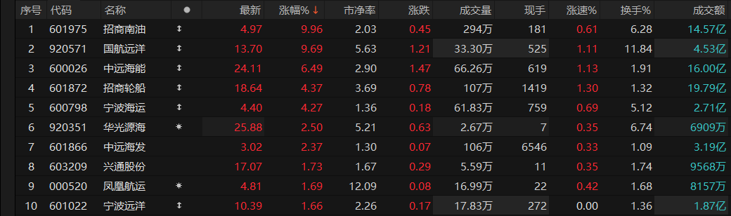 航运概念延续强势,招商南油(601975)2连板,国航远洋、中远海能(600026)、招商轮船(601872)、宁波海运(600798)跟涨。