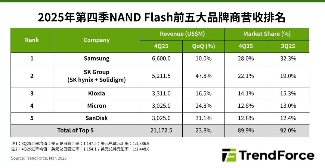 机构:AI服务器存储需求暴增,2025年Q4 NAND Flash前五大品牌厂营收合计大幅季增
