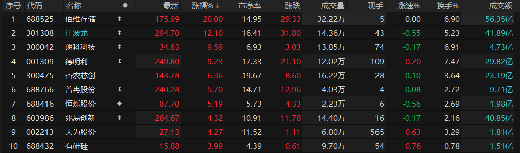 早盘存储芯片概念反弹,佰维存储触及20cm涨停,江波龙(301308)、朗科科技(300042)、德明利(001309)、香农芯创(300475)、普冉股份等涨幅靠前。