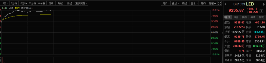 今日早盘,LED板块集体爆发,LED行业指数暴涨超10%。雷曼光电(300162)4分钟内20%封死涨停板,聚飞光电(300303)、聚灿光电(300708)、艾比森(300389)、联建光电(300269)、瑞丰光电(300241)皆20%涨停,恒太照明一度涨超25%。