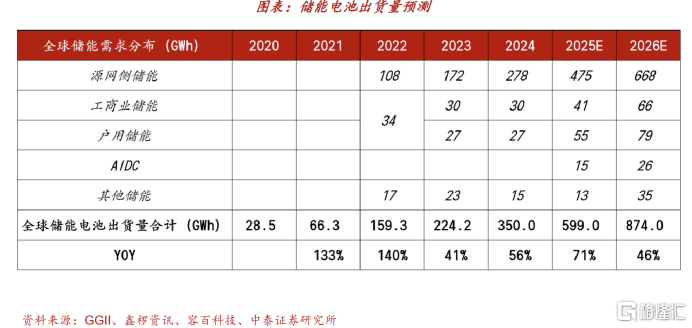 全球电池市场的增长动力正发生显著倾斜,储能电池成为当之无愧的领跑者。预计2026年全球储能电池出货量将达874GWh,同比大幅增长46%,其中源网侧储能凭借刚性需求成为主要增长动力,AIDC储能在AI算力驱动下装机量激增73%,工商业与户用储能也保持强劲增长。