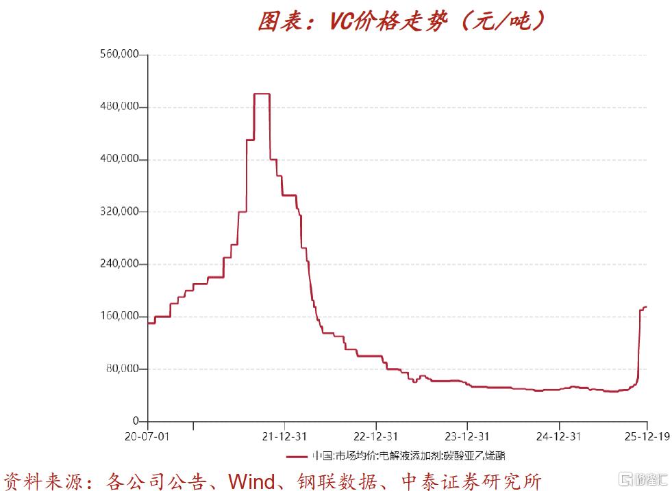 VC(碳酸亚乙烯酯)虽名义产能略显宽松,但供给端受环保安全审批严格制约,有效产能释放缓慢,且作为电池关键添加剂暂无成熟替代方案,需求端对价格不敏感,价格具备高弹性,供需扰动下易迎来涨价行情。