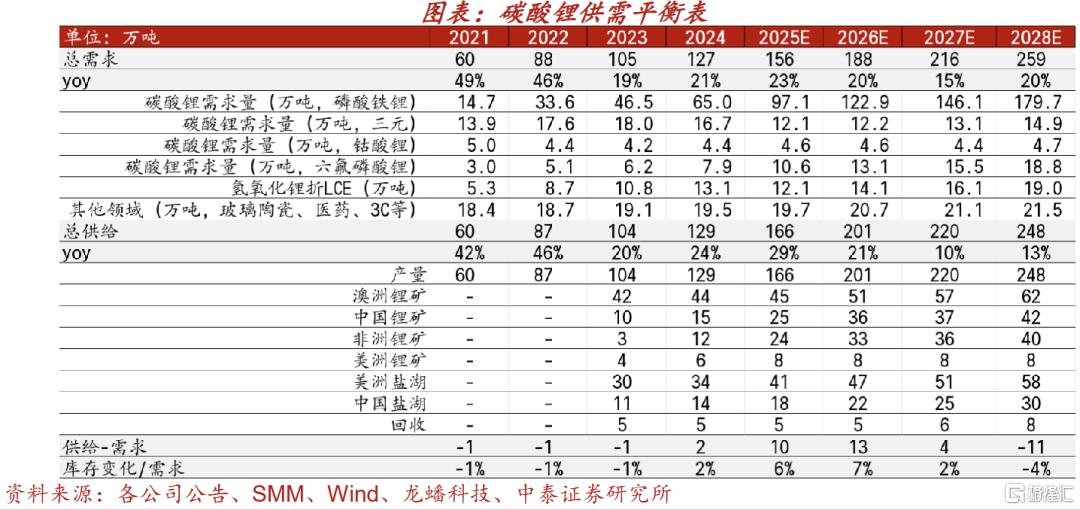 2026年全球碳酸锂需求将达188万吨LCE,2025-2028年复合增长率18%,需求保持高速增长;供给端2025-2026年为产能投放高峰,但2027年新增项目锐减,供给增速将骤降至10%左右,供需平衡对需求变化高度敏感,若需求小幅超预期,市场即可能转向紧缺。