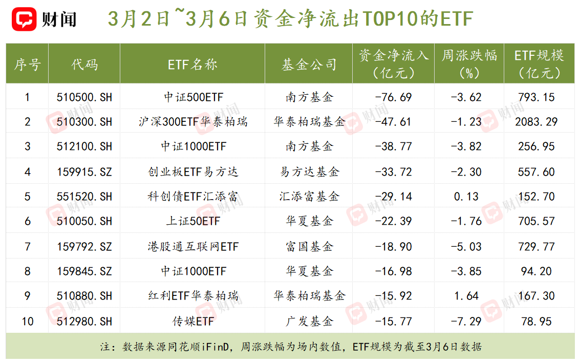 在资金流出方面,宽基ETF仍是主要流出方向。南方基金的中证500ETF、华泰柏瑞沪深300ETF以及南方基金的中证1000ETF位列资金净流出金额前三,分别净流出76.69亿元、47.61亿元和38.77亿元。