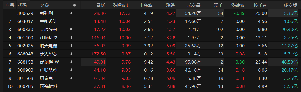 商业航天概念走强,新劲刚(300629)、优得刻-W涨超10%,中衡设计(603017)、天通股份(600330)、航天电器(002025)涨停。