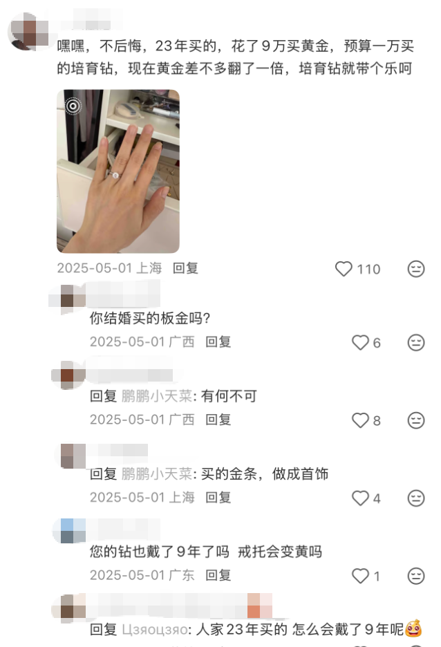 社交媒体上,一位上海的于女士也分享了购买培育钻石的经历,2023年她选择了一枚不到一万元的培育钻戒,将原本准备购买天然钻戒的钱省下来,花9万买了黄金。她说:“黄金差不多翻了一倍,培育钻就带个乐呵”。这种“悦己消费”对“符号消费”的替代,正是培育钻石市场逆势增长的核心动力。