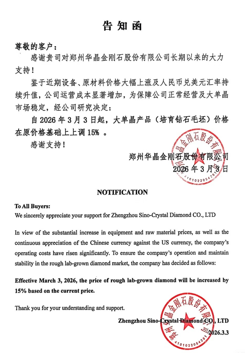 以郑州华晶金刚石为例,3月3日,该公司以中英文双语发布告知函,明确指出:鉴于近期设备、原材料价格大幅上涨及人民币兑美元汇率持续升值,公司运营成本显著增加,为保障公司正常经营及大单晶市场问题,经公司研究决定,自2026年3月3日起,大单晶产品(培育钻石毛坯)价格在原价格基础上上调15%。