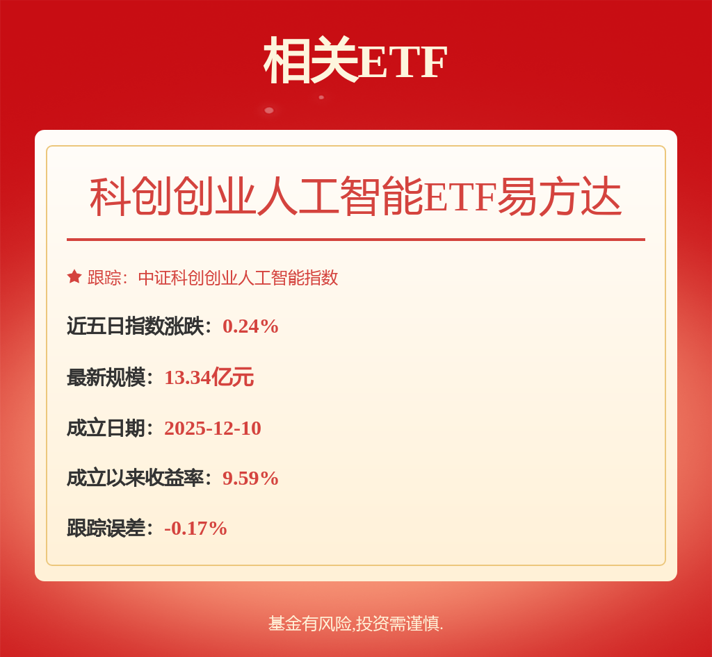 中证科创创业人工智能指数聚焦两创板块中人工智能领域企业,指数前五大权重股为澜起科技、中际旭创、新易盛、寒武纪、芯原股份,覆盖多只光模块和国产AI算力龙头。科创创业人工智能ETF易方达(159140)跟踪该指数,为投资者提供了一键打包AI算力产业链的便捷工具。