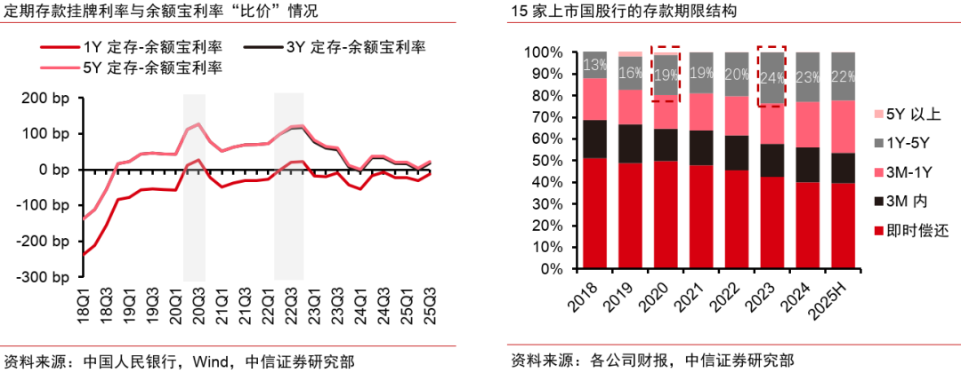 2)定期存款期限结构,与各类存款“比价关系”息息相关。近年来长期限定期存款(3年期、5年期)与余额宝利差处于高位的2020年和2023年,国股行剩余期限在1-5年的存款(主要是3年期存款品种)占比显著提升。