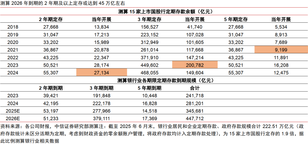 1)2025年和2026年中长期定存到期量分别为35万亿和45万亿元,显著高于此前年份20-30万亿元的到期规模;