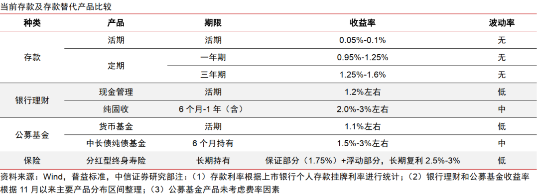 1)银行存款看,短期化或是方向。存款利率持续下行后,到期中长期定存原期限续作可能性下降,居民选择短期定存产品的概率较高。