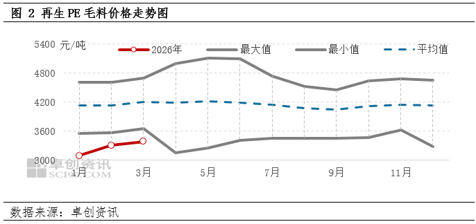 未来半年,再生PE市场预计呈现“先稳后弱”走势,伴随供需矛盾逐步深化。2026年3月以来,新料价格高位及毛料供应紧张支撑再生PE价格稳中上涨。4-6月,需求旺季将对再生PE价格形成支撑,但7-9月随着新料新增产能释放,供应过剩加剧,再生PE价格承压下行。