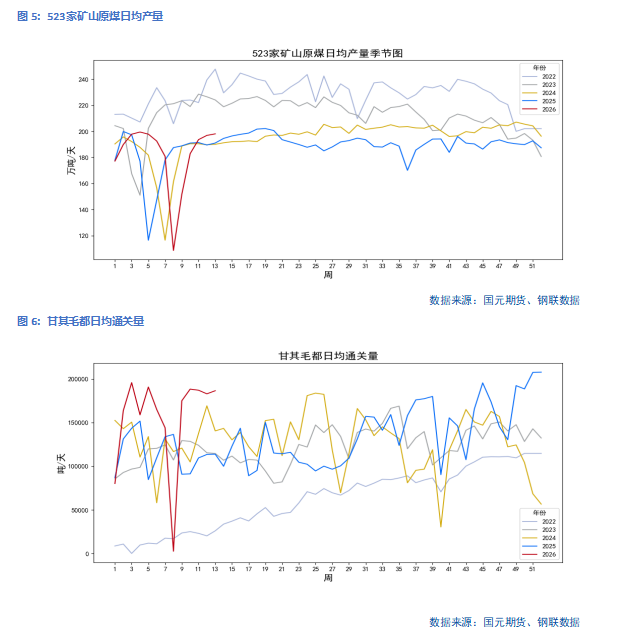 上周,523家炼焦煤矿山开工率为89.16%,周环比增加0.57个百分点;原煤日均产量为198.05万吨/天,周环比增加0.60%;精煤日均产量为78.6万吨/天,周环比下降1.52%。上周,314家样本洗煤厂产能利用率为34.78%,周环比增加1.77个百分点;洗煤厂精煤日均产量为25.89万吨/天,周环比增加6.50%;甘其毛都口岸日均通关量为186462.0吨/天,周环比增加1.93%。