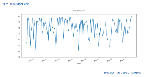 上周,焦煤挂牌量为185.45万吨,周环比增加57.25%;竞拍成交率为99.51%,周环比增加9.52个百分点。