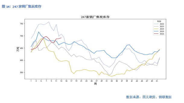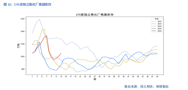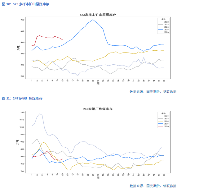 上周,247家钢厂焦煤库存为782.41万吨,周环比增加1.10%;270家独立焦化厂焦煤库存为1047.54万吨,周环比增加4.23%;港口焦煤库存为264.95万吨,周环比增加1.69%;上周,矿山精煤库存为222.83万吨,周环比下降12.30%;矿山原煤库存为523.02万吨,周环比下降2.54%。