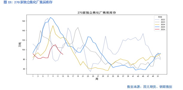 上周,247家钢厂焦炭库存为691.67万吨,周环比增加0.51%;270家独立焦化厂焦炭库存为90.05万吨,周环比下降4.44%;港口焦炭库存为216.11万吨,周环比增加8.53%。
